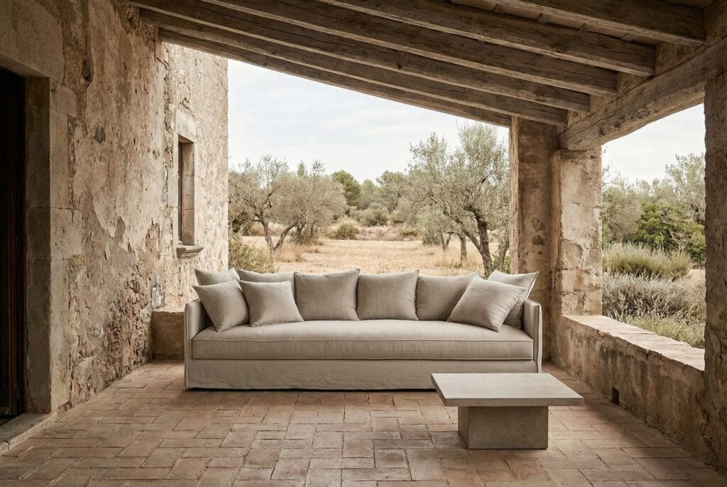 Este mueble está diseñado para espacios exteriores cubiertos o semicubiertos, como terrazas techadas, porches o balcones. Sus materiales resisten la humedad ambiental y los cambios de temperatura, pero no debe exponerse directamente a la lluvia ni dejarse a la intemperie sin protección, ya que la exposición directa al agua puede deteriorar los tejidos y las estructuras internas.