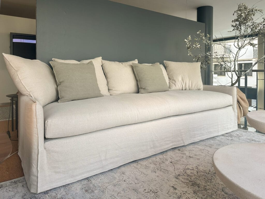 Modelo 2 brazos, estructura en dos tramos, cojín asiento liso. L276 x P111 x H87. B. 18. Tejido. Lino Atemporal Nº54.