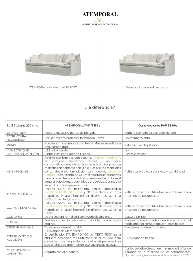 El periodo de garantía es un signo inequívoco de que en su nuevo sofá se han utilizado para su fabricación materiales de primera calidad. Atemporal ofrece periodos de Garantía muy superiores a los estándares de nuestro mercado fruto de la calidad en las materias primas seleccionadas en nuestro proceso de fabricación.